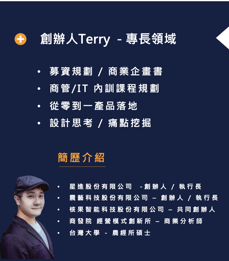 Terry從學生時期就開始創業,創辦過5間不同的新創公司,籌備過超過20項專案與生意,有失敗收場,有成功出售,也有持有股份持續獲利,具備豐富的實務經驗。